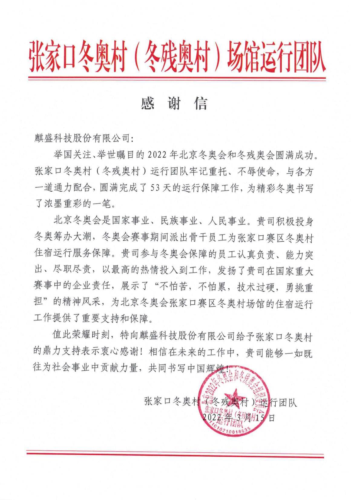 日前,kaiyun·开运电竞版-官方入口收到了来自张家口冬奥村(冬残奥村)运行团队的一封感谢信——