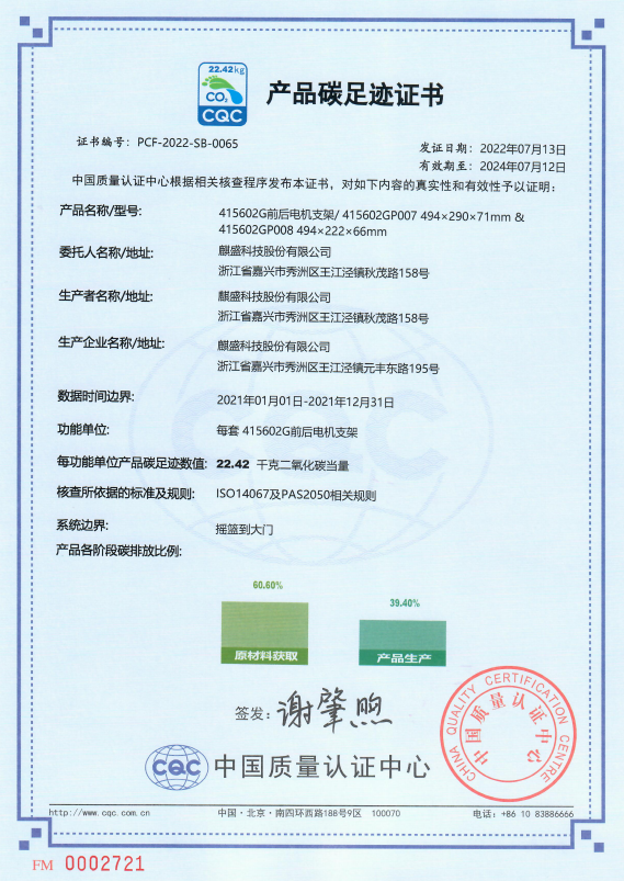 Ëùν¡°Ì¼×ã¼£ÈÏÖ¤¡±£¬ÊÇÖ¸ÓÉרҵ»ú¹¹²Î¿¼ºËËã±ê×¼£¬´ÓÈ«ÉúÃüÖÜÆÚµÄ½Ç¶È£¬×Ô϶øÉ϶ԲúƷ̼ÅÅ·ÅÁ¿½øÐкËËãÓëÖ¤Ã÷¡£±¾´Î̼×ã¼£ºË²é£¬ÎÒÃÇ»ùÓÚ¡°´ÓÒ¡Àºµ½´óÃÅ¡±µÄ·½·¨Ñ§£¬¶Ô415602GÐͺÅǰºóµç»úÖ§¼ÜµÄÔ²ÄÁÏ¿ª²É¡¢²úÆ·Éú²ú¡¢¼Ó¹¤¡¢ÅäÌ×°ü×°¡¢·ÖÏú³ö³§µÈ¶à¸ö½×¶ÎµÄ¸÷ÖÖÎÂÊÒÆøÌåÅÅ·ÅÁ¿½øÐÐÀÛ¼Ó¡£¾ÀúÁËר¼ÒÅàѵ¡¢ÆóÒµ×ÔÆÀ¡¢×¨¼ÒºË²é¡¢ÏÖ³¡ÆÀ¹À¡¢ÑéÊÕ´ð±çµÈ½×¶Î£¬ÎÒÃǶԲúÆ·ÉúÃüÖÜÆÚÖÐÿ¸ö»·½ÚµÄÖ÷ÒªÎÂÊÒÆøÌåÅÅ·ÅÓÐÁËÁ¿»¯µÄÈÏÖª£¬ÒÀ¾ÝISO 14067¡¶ÎÂÊÒÆøÌå²úƷ̼×ã¼£Á¿»¯ÒªÇóºÍÖ¸ÄÏ¡·¼°PAS 2050¡¶ÉÌÆ·ºÍ·þÎñÔÚÉúÃüÖÜÆÚÄÚµÄÎÂÊÒÆøÌåÅÅ·ÅÆÀ¼Û¹æ·¶¡·Ïà¹Ø¹æÔò£¬ºËËã³öµ¥Î»415602GµÄ̼×ã¼£ÊýֵΪ22.42KG¶þÑõ»¯Ì¼µ±Á¿¡£